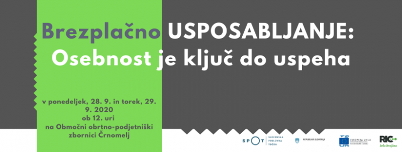 SPOT Svetovanje JV Slovenija v koordinaciji RIC Bela krajina vabi na brezplačno USPOSABLJANJE: Osebnost je ključ do uspeha, ki bo v ponedeljek, 28. 9. in torek, 29. 9.2020 ob 12. uri na Območni obrtno- podjetniški zbornici Črnomelj, Ulica 21. oktobra 10, 8340 Črnomelj.