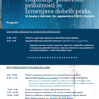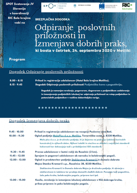 SPOT svetovanje JV Slovenija v koordinaciji RIC Bela krajina vabi na brezplačna dogodka "ODPIRANJE POSLOVNIH PRILOŽNOSTI IN IZMENJAVA DOBRIH PRAKS", ki bosta v četrtek, 24. septembra 2020 v Metliki.