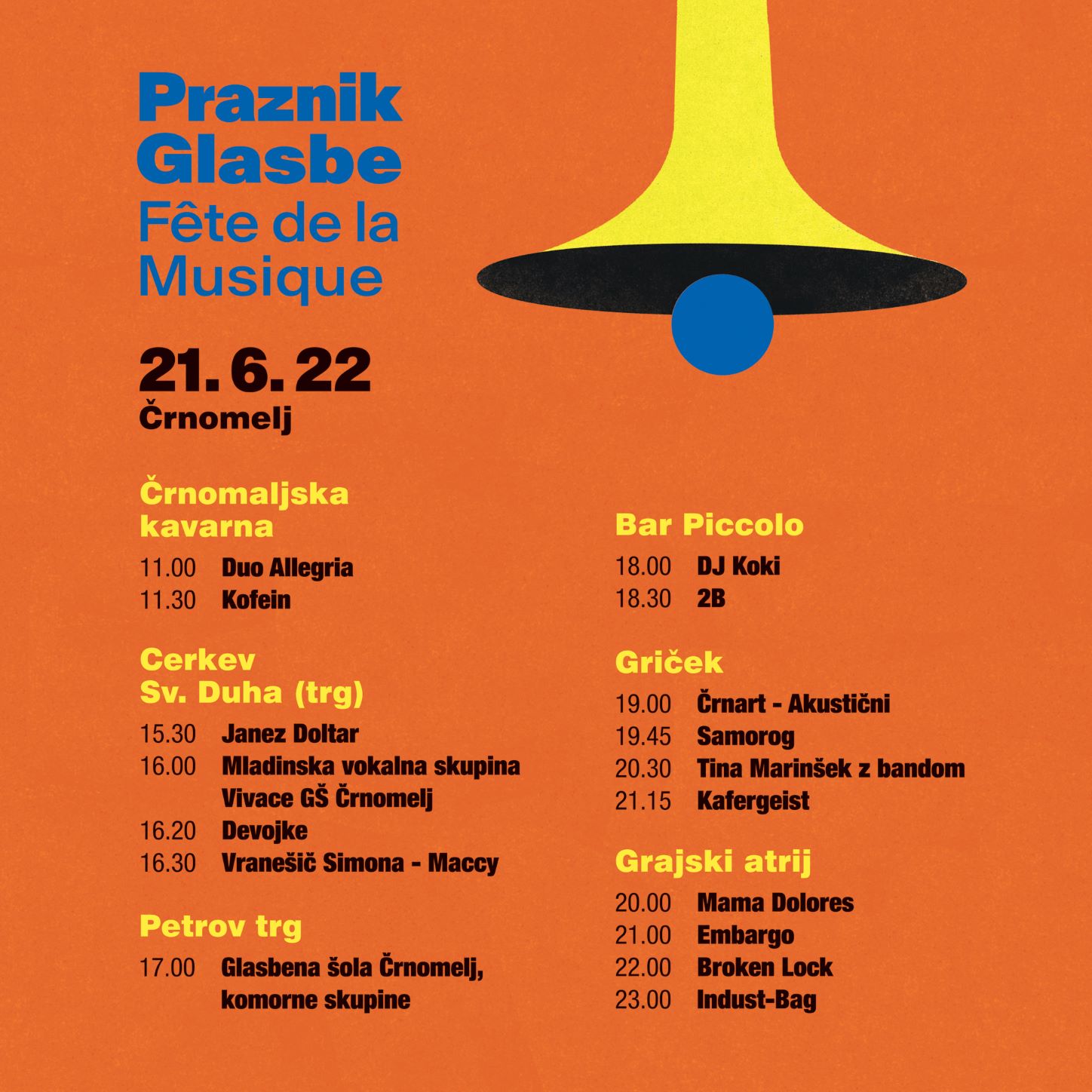 Znan je program prvega Praznika glasbe v Črnomlju. Program bo potekal med 11. in 24. uro na različnih lokacijah v mestu (Črnomaljska kavarna, Cerkev Sv. Duha, Bar Piccolo, Petrov trg, Griček in atrij Črnomaljskega gradu).