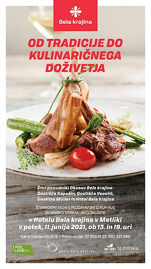 Vabljeni v petek, 11. junija 2021, ob 13. in 19. uri v Hotel Bela krajina v Metliko na belokranjsko kulinarično razvajanje.